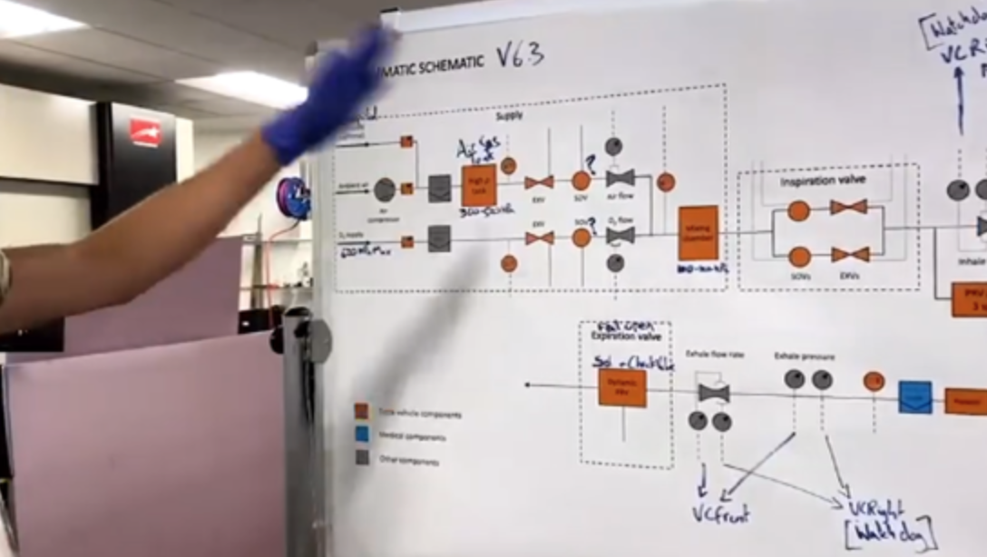 下图是特斯拉呼吸机的总体设计图,图中橘色的模块都是特斯拉汽车上的部件。