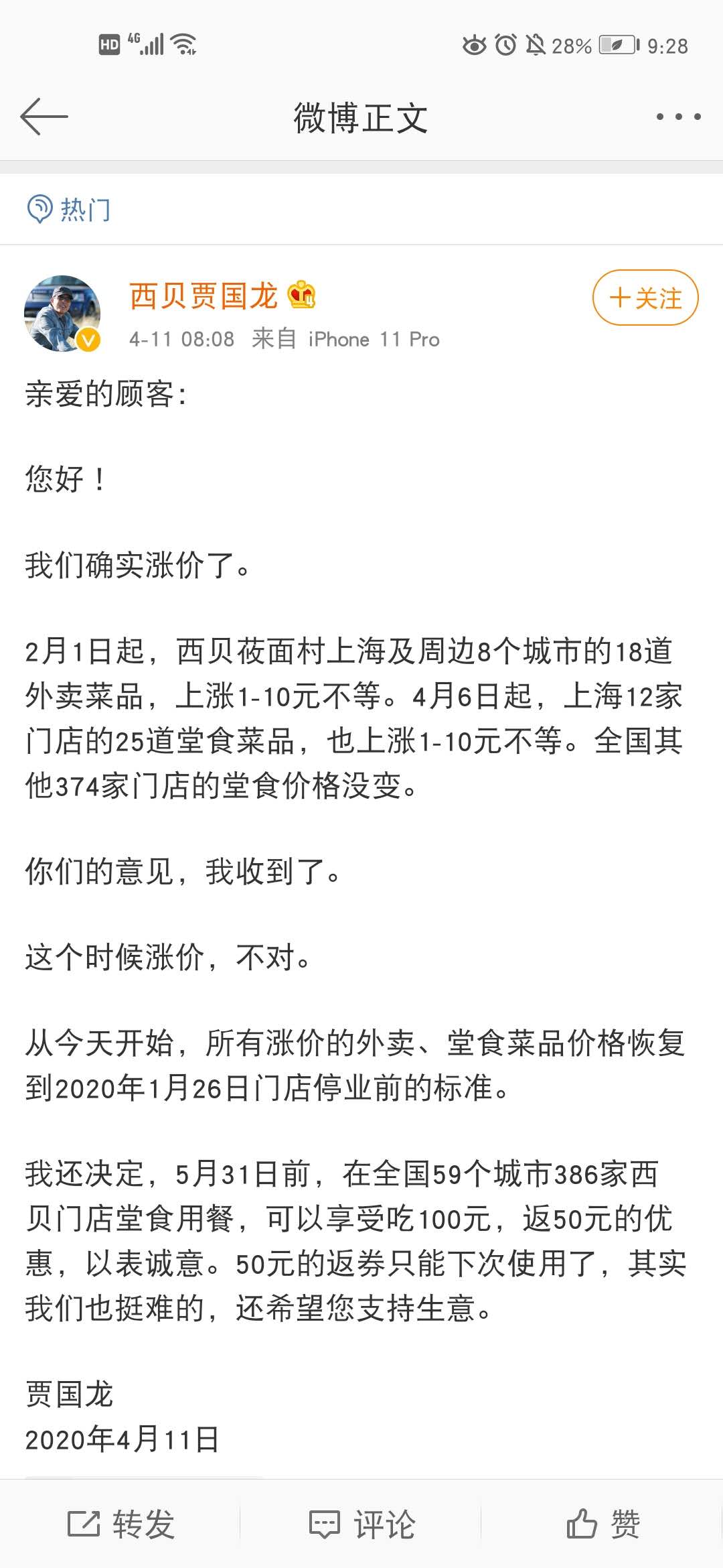 继海底捞涨价又道歉并恢复原价之后,西贝也出现反转了。4月11日早,西贝董事长贾国龙在个人微博发布声明称,“我们确实涨价了,这时候涨价不对。从今天开始,所有涨价的外卖、堂食菜品价格恢复到2020年1月26日门店停业前的标准。”