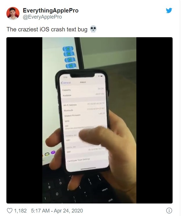 4月24日消息 每隔一段时间,iOS中就会出现一种奇怪的bug,那就是某一串文字会导致iPhone或iPad死机。本周,又有一则这样的文字串被发现,而苹果公司的修复措施还未公开。