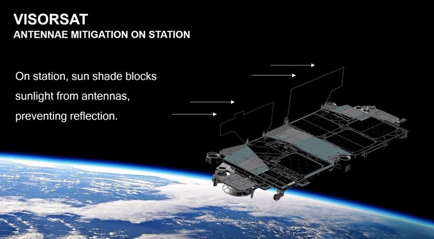 马斯克和SpaceX的其他人此前曾讨论过“遮阳伞”解决方案,他们将其比作从卫星上展开的庭院伞,使天线保持在阴影中。马斯克最近解释了VisorSat的概念,旨在部署遮阳板以阻挡阳光,就像安装在汽车挡风玻璃上的遮阳板。