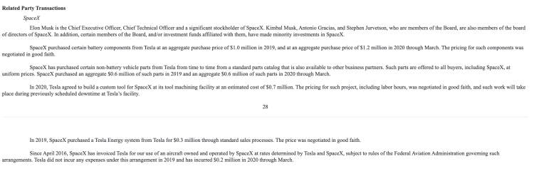 SpaceX在2019年购买了总计60万美元的此类零件。SpaceX不时地从特斯拉的标准零件目录中购买某些非电池汽车零件,该目录也可供其他商业伙伴使用。此类零件以统一价格提供给所有买家,包括SpaceX。