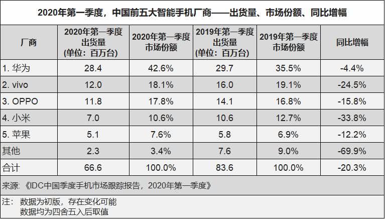 5月6日消息,IDC发布的2020年第一季度中国智能手机报显示,受疫情冲击,中国智能手机市场出货量下滑了20.3%,整体出货量约6660万台。国内智能手机前五大品牌——华为(含荣耀)、vivo、OPPO、小米和苹果的出货量均现下滑,但其中排名第一的华为跌幅最小,同比下跌4.4%。