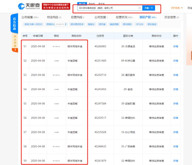 新京报记者通过天眼查获知,4月8日,深圳顺丰泰森控股(集团)有限公司在方便食品、啤酒饮料、运输贮藏等类别上申请“顺丰同城丰食”“风食团餐”注册商标。截至5月11日,上述商标均在“等待实质审查”,尚未注册完成。而深圳顺丰泰森控股是深圳顺丰同城信息技术公司的间接百分百控股股东。