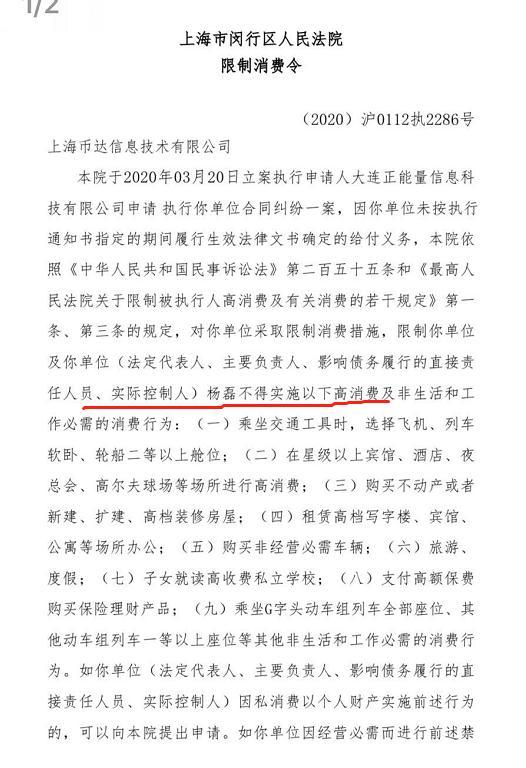 5月11日消息,近日据天眼查数据显示,中国裁判文书网日前披露大连正能量信息科技有限公司与上海币达信息技术有限公司(爱代驾)合同纠纷案进展,上海市闵行区人民法院日前向币达公司主要负责人杨磊发布限制消费令。