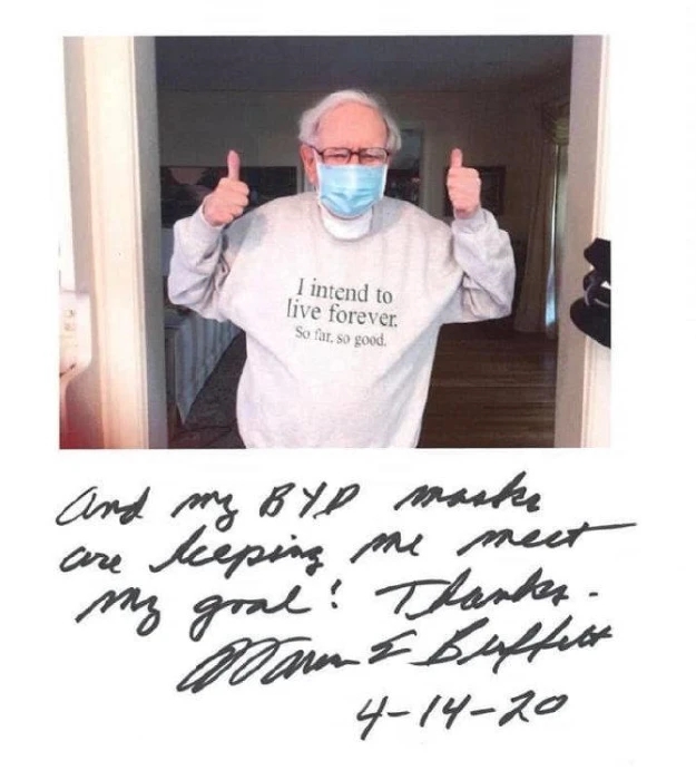 为巴菲特和比亚迪牵线的喜马拉雅资本创始人李录4月14日在Facebook上发布了一张巴菲特戴着蓝色口罩的照片,这位89岁的投资者身穿运动衫,上面写着:“我想要长命百岁!”照片下面是巴菲特的签名和手写文字,“比亚迪口罩正帮助我实现目标”。