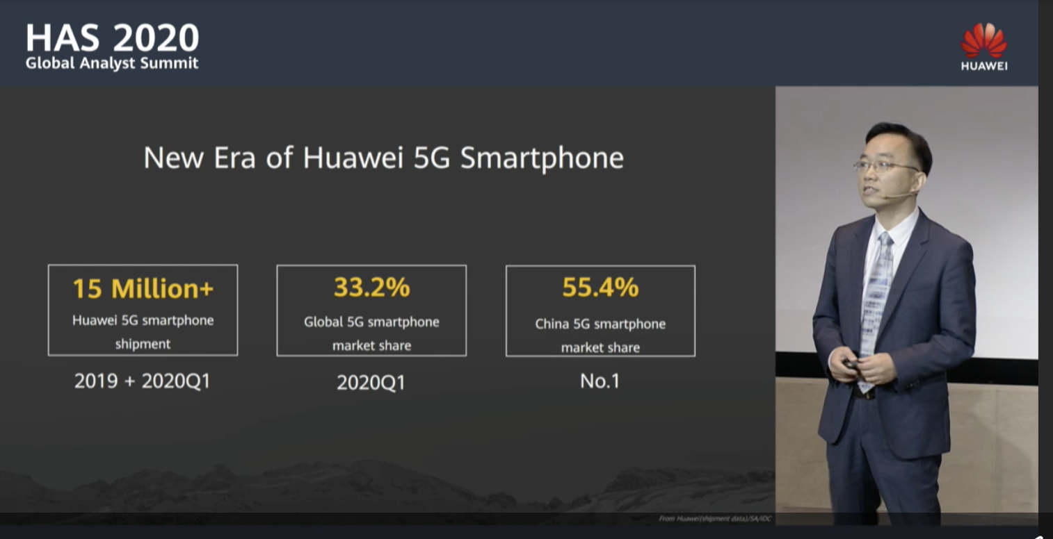 盛行表示,到2020年第一季度,华为5G手机的出货量1500万台,在全球5G手机市场出货量占比33.2%,在中国5G手机市场出货量占比55.4%,位居市场第一。
