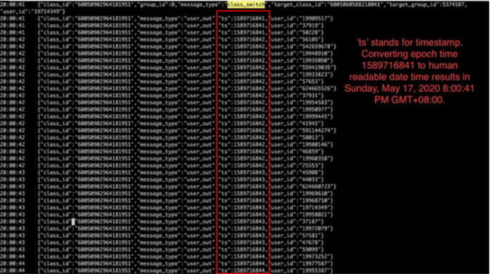 Agent ID and agent policy 为分布式服务器内部节点处理的编号和消息处理规则。GSX 的数据源为直播系统日志,输出的数据结果与上述两个字段无关,且与用户行为无关。我们发布的截屏中,清清楚楚的显示了 timestamp,标记为 ts,该字段“ts:1589716841”的意思如下图所示,时间为2020年5月17日8:00:41PM,我们特地选取浑水报告前一天的日志,方便读者对应。