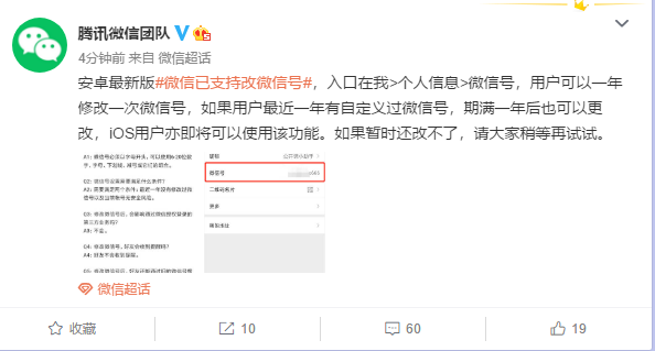 今日(6月5日),腾讯微信团队宣布,安卓最新版已经支持更改微信号功能,对iOS版本的支持也即将上线。
