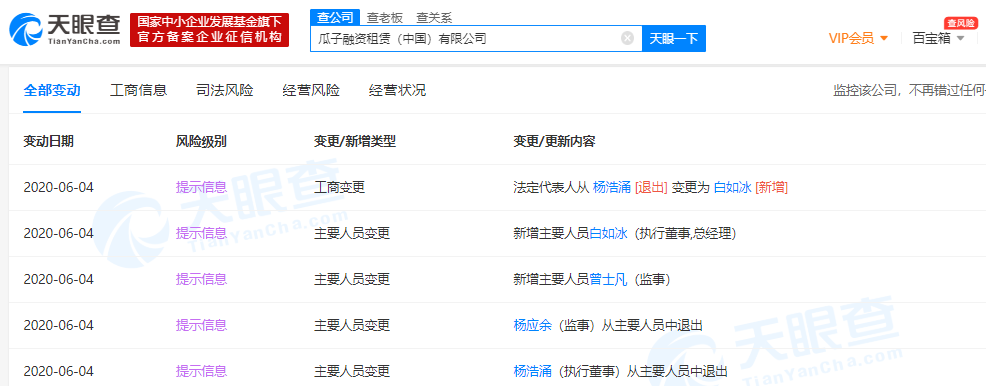 6月5日消息,天眼查数据显示,近日,瓜子融资租赁(中国)有限公司发生工商变更,车好多集团CEO杨浩涌卸任法定代表人、执行董事,由白如冰担任。