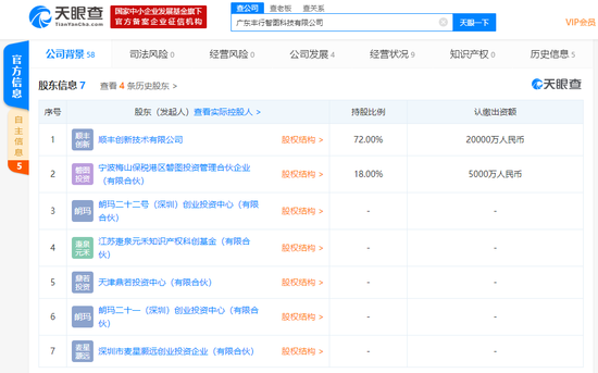 广东丰行智图科技有限公司成立于2018年9月,法定代表人为丰行智图CEO周训飞,公司经营范围包括数字地图设计、开发、地理遥感信息服务,研发、生产计算机软件;计算机系统集成等。天眼查数据显示,该公司工商披露的股东信息中,顺丰创新技术有限公司为该公司第一大股东,持股比例为72%。