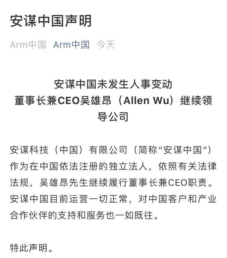 安谋科技(中国)有限公司(简称“安谋中国”)作为在中国依法注册的独立法人,依照有关法律法规,吴雄昂先生继续履行董事长兼CEO职责。安谋中国目前运营一切正常,对中国客户和产业合作伙伴的支持和服务也一如既往。