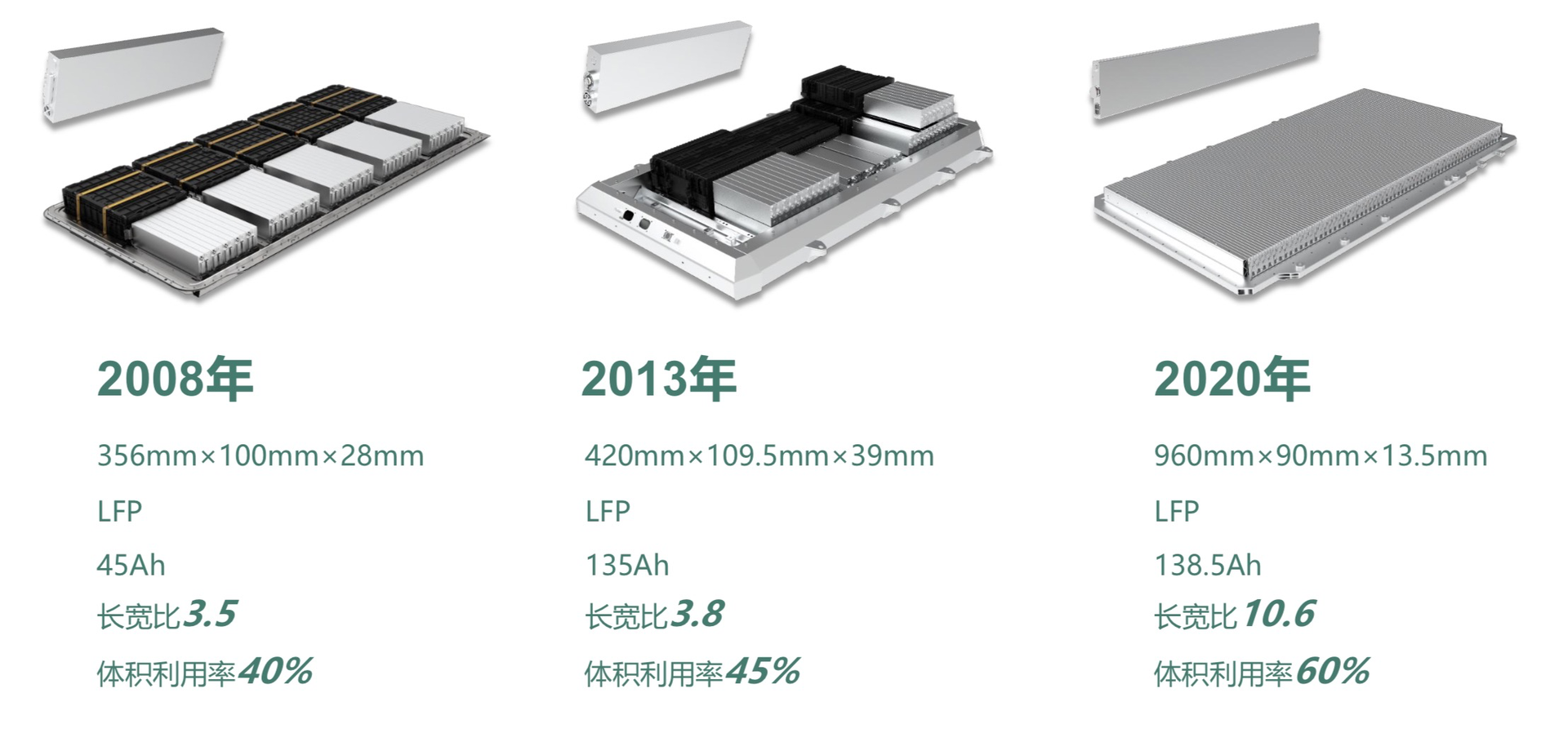 相比上一代动力电池,刀片电池的零件数量从1236件减少至756件,不仅体积能量密度有所增长,利用率也由原先的40%增长至60%。