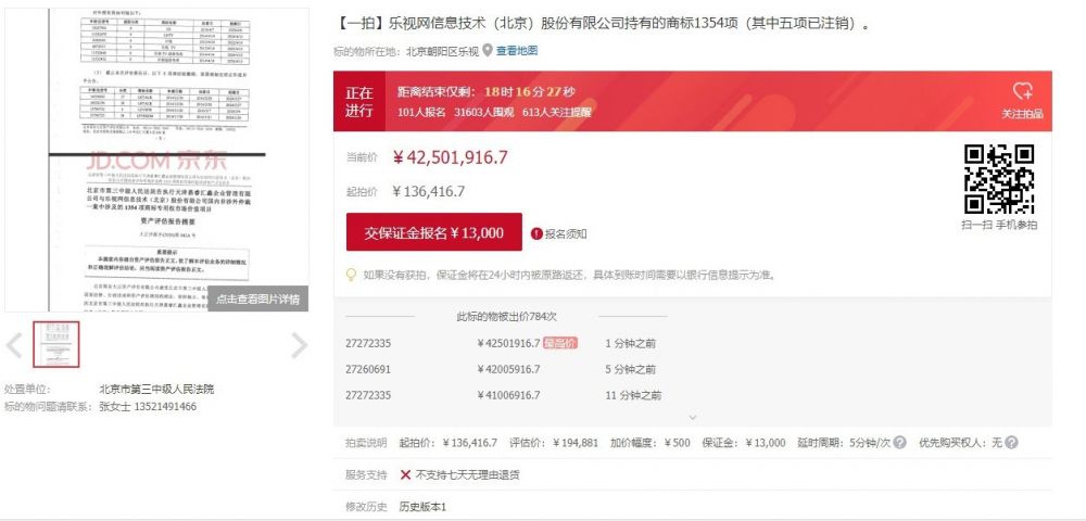 6月29日消息 今天上午10点,乐视网信息技术(北京)股份有限公司持有的1354项商标(其中五项已注销)在京东拍卖平台开拍,起拍价格为136416.7元。