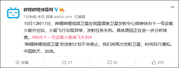 7月10日,哔哩哔哩官方微博发布消息称,10日12时17分,哔哩哔哩视频卫星在我国酒泉卫星发射中心搭乘快舟十一号运载火箭升空后,火箭飞行出现异常,发射任务失利。具体原因正在进一步分析排查。