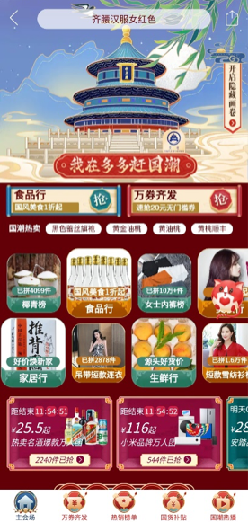 7月10日消息,今日,拼多多开启为期一周的国潮市集活动,服饰类目将以汉服为代表,搭建古风穿越馆等多个活动会场,享受平台百亿补贴、秒杀万人团以及超品促销等多重优惠。7月10日至16日,用户上拼多多搜索“国潮画卷”即可进入活动专题页面。