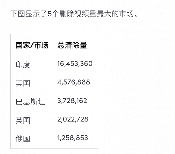 报告显示,以下5个国家为删除视频最多的国家,前三名依次为:印度、美国、巴基斯坦。