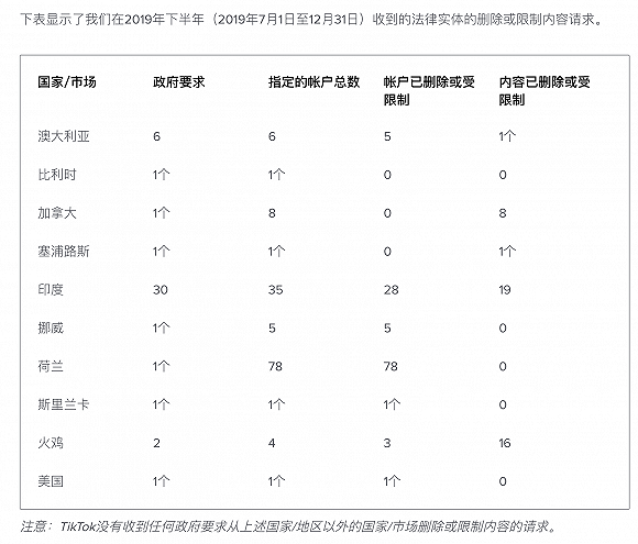 以上有关政府请求中,TikTok并未收到来自中国内地和香港地区的用户信息申请或内容删除要求。