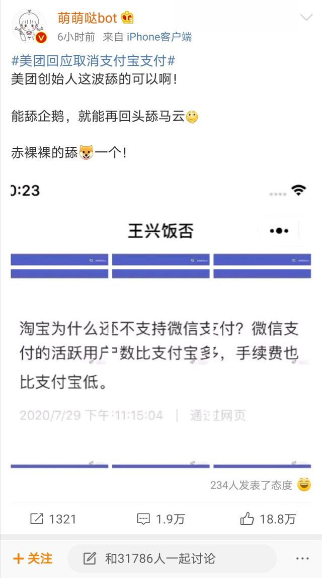 虽然美团月付快速删除了相关微博内容,但其CEO王兴又再次在社交媒体回应,”淘宝为什么还不支持微信支付?微信支付的活跃用户数比支付宝多,手续费也比支付宝低”,直接引发网友众怒。