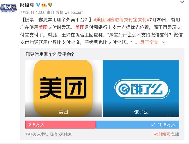 在媒体发起的”外卖平台该不该为用户选择支付方式”调查中,有73%的用户选择了”不应该,用户有自由选择权”。在媒体发起的投票中,有超过50%的用户表示更常用饿了么。对于美团这一系列操作,有不少有网友表示 “我只能卸载美团了”。 在舆论压力下,今日,美团疑似悄悄恢复支付宝支付。