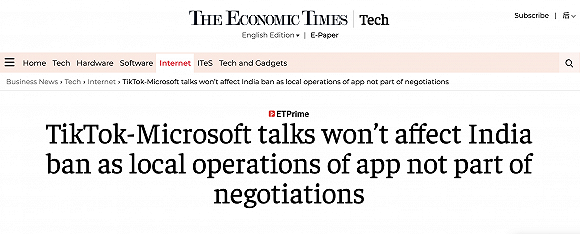 据印度《经济时报》4日报道,一位知情的印度政府高级官员表示,微软谈判收购TikTok美国业务,不会影响TikTok在印度面临的禁令,因为上述收购谈判并不包含本土运营内容。