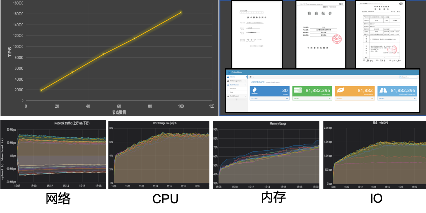 本次测试环境为部署在全国10个不同城市的机房中的100个公有云节点,每个节点之间均通过固定上限带宽的公网通信。公有云虚拟机的配置为双核、4GB内存、20Mbps(2.5MB/s)网络带宽、设备硬件配置及网络环境更加接近实际应用场景生产环境。测试结果显示北大数瑞分布式账本系统在公网环境、100节点规模下的存证性能可超过16万TPS;而且随着节点数目的增加,整个网络的吞吐率呈现线性增加趋势,实测效果可以更好满足大数据、工业互联网、物联网等高并发场景的实际需求。