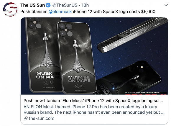 13日消息,据Fox Business报道,俄罗斯手机配件公司鱼子酱(Caviar)正在接受以SpaceX为主题的手机定制,名为“马斯克在火星上iPhone 12”。产品价格为5000美元。消费者只需花费大约5000美元,即可获得一款以SpaceX为主题的手机,上面印一枚SpaceX猎鹰火箭和马斯克的签名。
