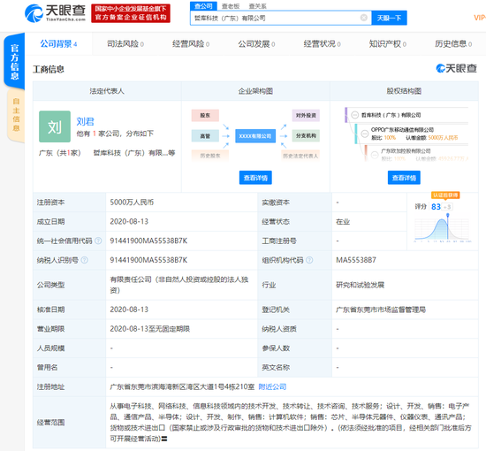 天眼查APP显示,8月13日,哲库科技(广东)有限公司成立,该公司注册资本5000万人民币,由OPPO广东移动通信有限公司全资持股。经营范围包括设计、开发和销售半导体、芯片等。