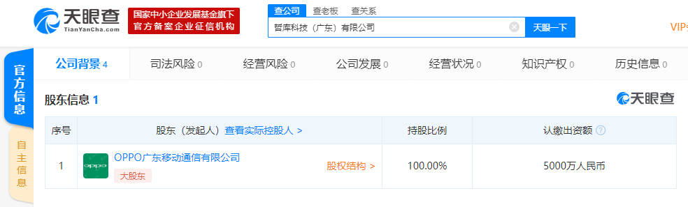 该公司由OPPO广东移动通信有限公司100%持股。