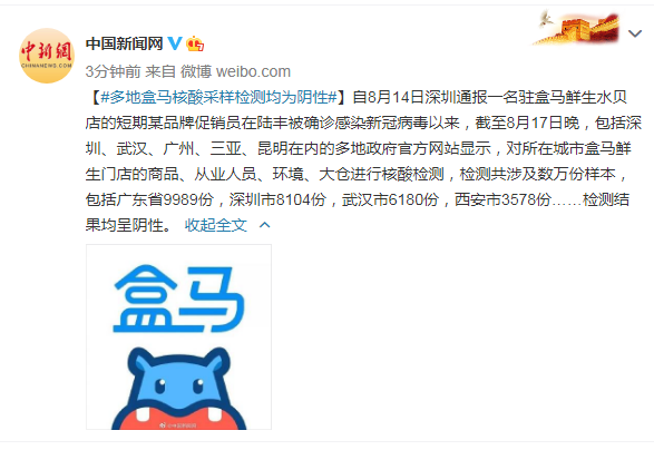 自8月14日深圳通报一名驻盒马鲜生水贝店的短期某品牌促销员在陆丰被确诊感染新冠病毒以来,截至8月17日晚,包括深圳、武汉、广州、三亚、昆明在内的多地政府官方网站显示,对所在城市盒马鲜生门店的商品、从业人员、环境、大仓进行核酸检测,检测共涉及数万份样本,包括广东省9989份,深圳市8104份,武汉市6180份,西安市3578份……检测结果均呈阴性。