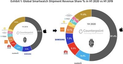 8月21日消息 根据 Counterpoint Research 分享的新数据,2020年上半年,Apple Watch 占全球智能手表市场收入的51.4%。