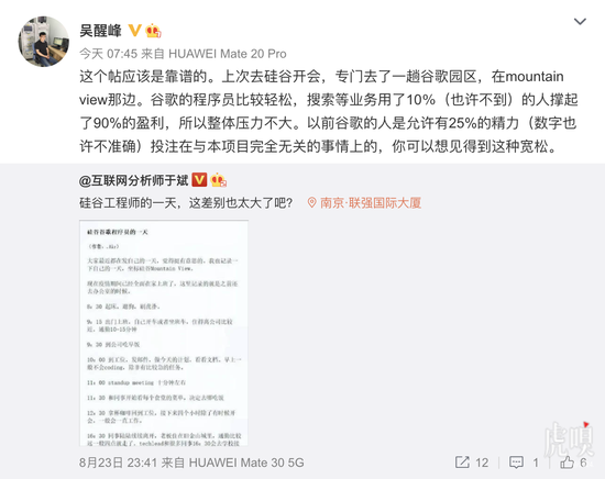 对于上述消息,华为前专家吴醒峰博士转发了该微博,并称信息是靠谱的,他此前去硅谷开会专门去谷歌园区参观过,了解到 “搜索等业务用了10%(也许不到)的人撑起了90% 的盈利,所以整体压力不大”以及 “以前谷歌的人是允许有25% 的精力投注在与本项目完全无关的事情上的,你可以想见得到这种宽松。”