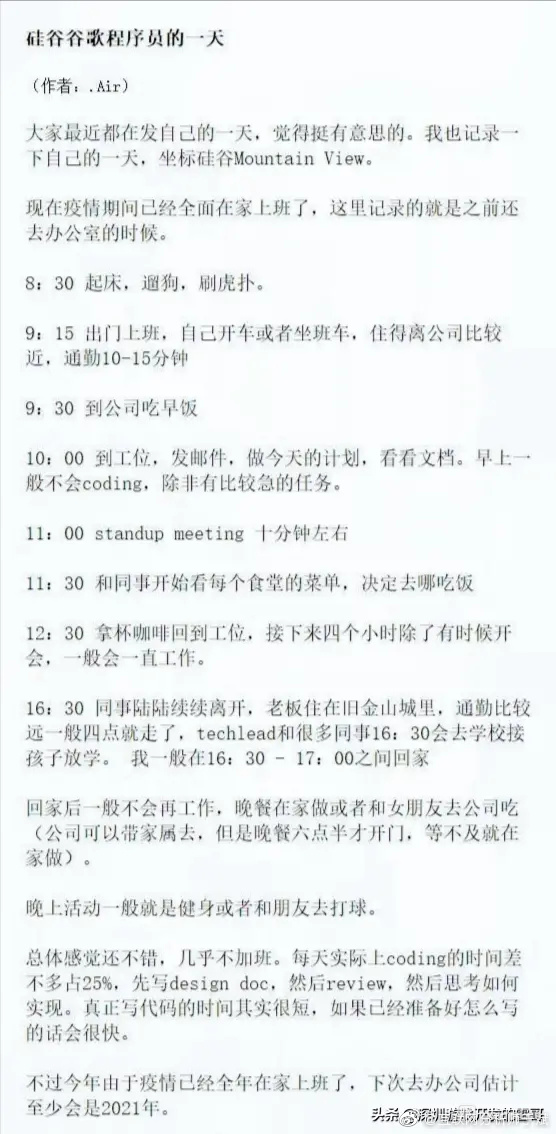 最近,有网友分享了谷歌程序员 “.Air”工作日的一天,其悠哉程度甚至超过国内朝九晚五的工作者。作者还称自己部门几乎不会加班,现在更是因为疫情索性直接在家办公,不用去公司了。