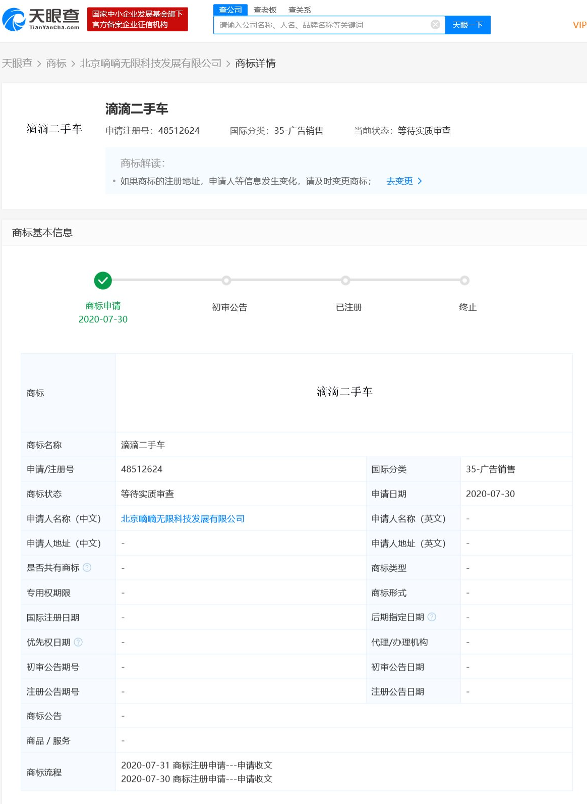 天眼查APP显示,近日,北京嘀嘀无限科技发展有限公司新增商标信息,名称为“滴滴二手车”。国际分类为35-广告销售、36-金融物管,商标状态为“等待实质审查”。商标流程为“商标注册申请—申请收文”。