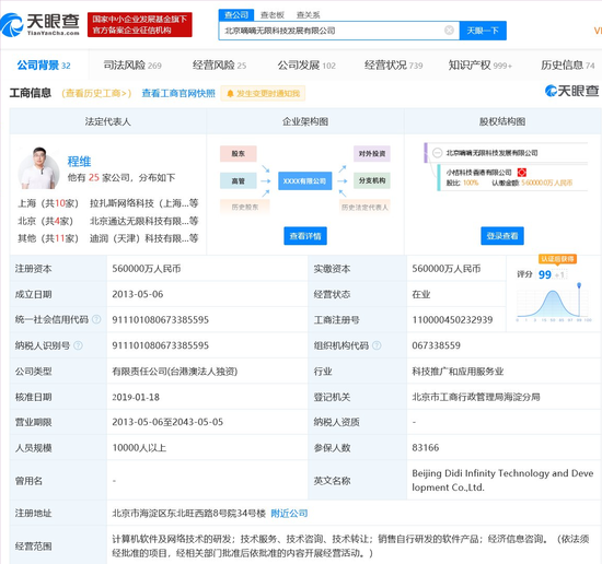 北京嘀嘀无限科技发展有限公司成立于2013年5月,注册资本56亿人民币,法定代表人为程维,公司经营范围包括计算机软件及网络技术的研发;技术服务、技术咨询、技术转让;销售自行研发的软件产品;经济信息咨询。天眼查APP股东数据显示,该公司为小桔科技香港有限公司的全资子公司。