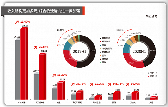 财报显示,2020年上半年,顺丰的核心业务——速运物流业务件量36.55亿票,同比增长81.3%,远高于22.1%的行业增长率。其中,顺丰传统的优势板块——时效件业务延续了上年末增速回升的态势,报告期内营收319.62亿元,同比增长19.42%,在总营收中占比44.94%。