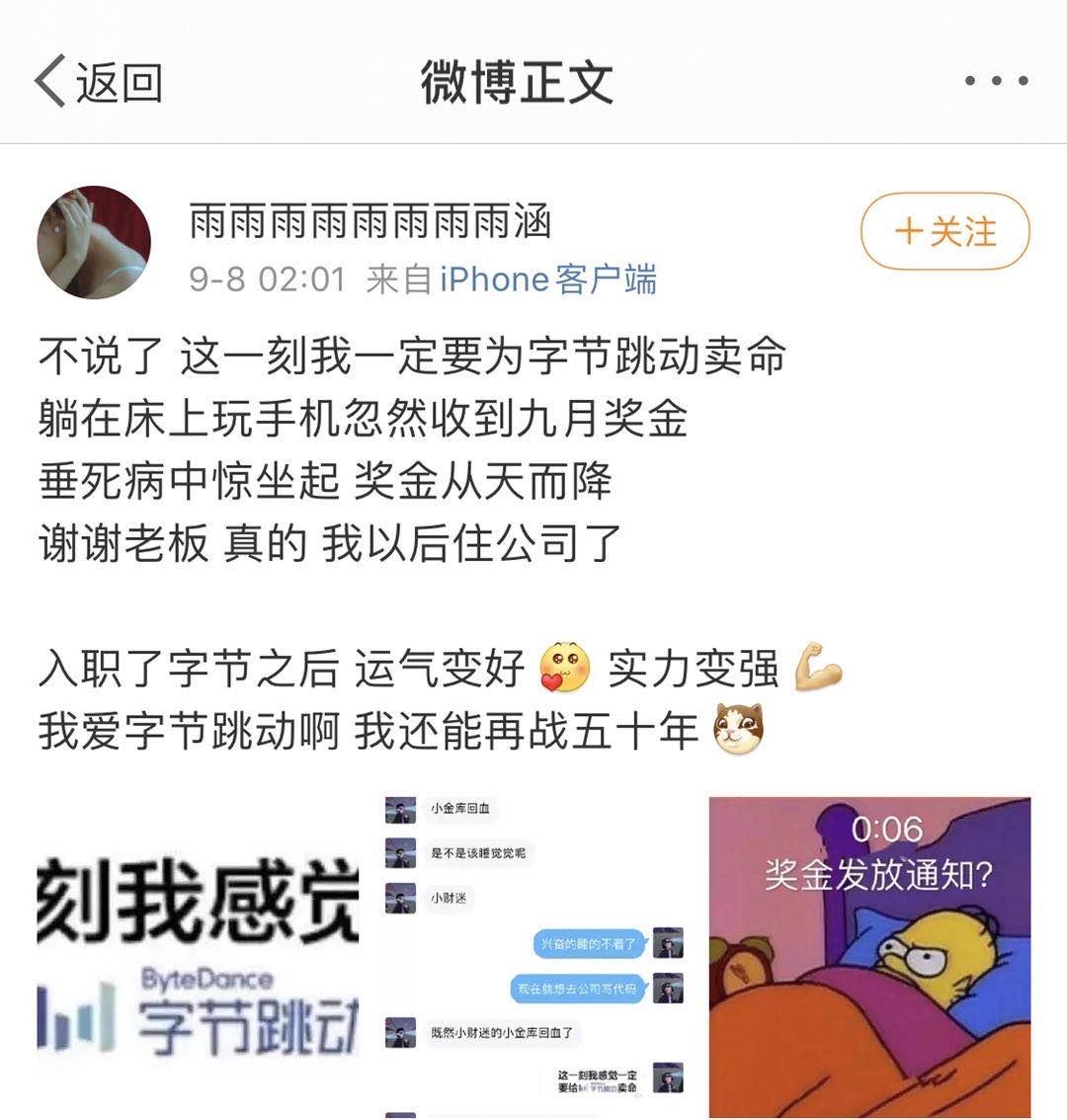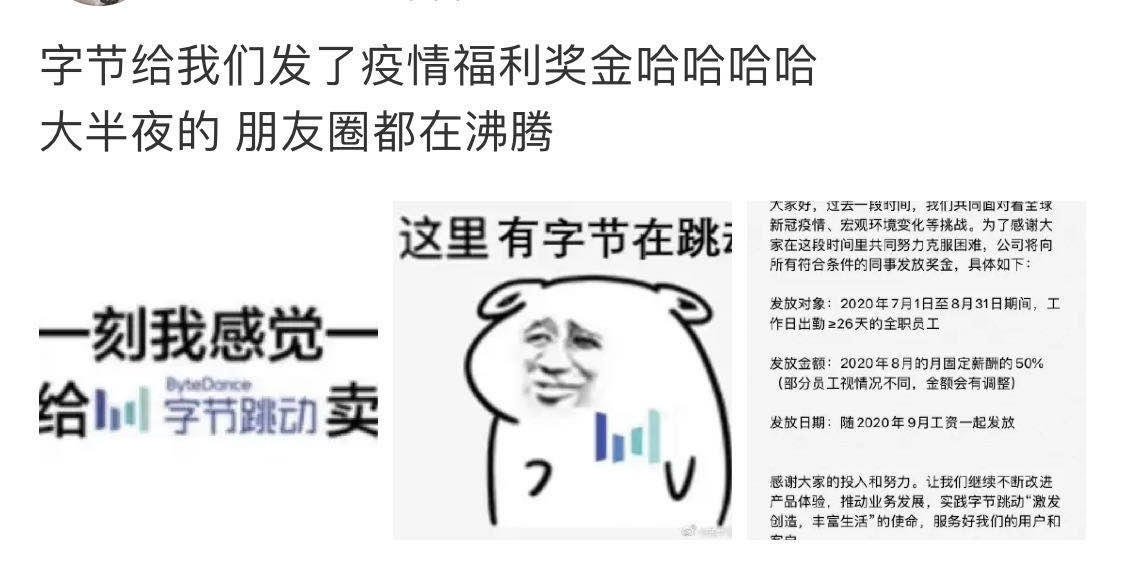 TikTok在美业务出售事宜尘埃未落,9月8日凌晨,字节跳动发布全员信表示,为感谢员工过去一段时间共同面对全球新冠疫情、宏观环境变化等挑战,公司将向所有符合条件的同事发放奖金:2020年7月1日至8月31日,工作日出勤≥26天的全职员工,将获8月份固定薪资的50%。