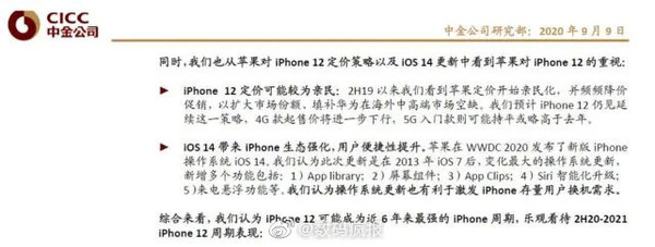 此外,该机构表示,苹果在WWDC 2020上发布了全新操作系统iOS 14,此次更新是在2013年iOS 7之后,变化最大的操作系统更新,新增了多个功能,强化了iPhone的生态,用户操作便捷性提升,操作系统的更新也有利于激发iPhone存量用户换机需求。该机构预测,iPhone 12可能成为近6年来最强的iPhone周期。