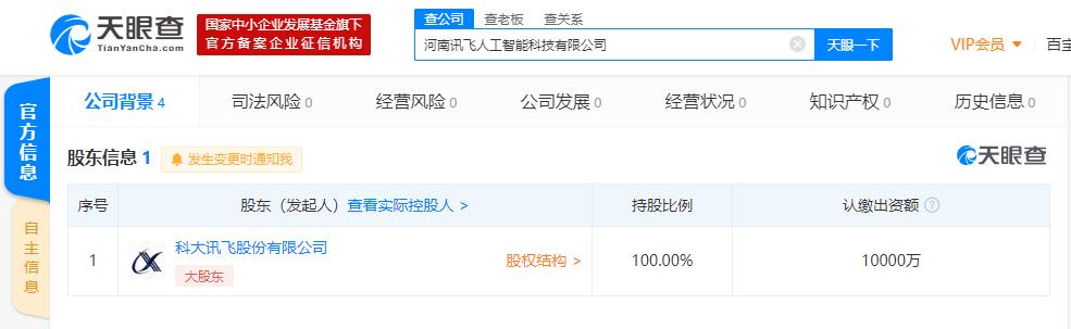 天眼查APP显示,近日,河南讯飞人工智能科技有限公司成立,法定代表人为孙亮,注册资本一亿,经营范围包括智能产品技术开发、技术服务、技术咨询;计算机软硬件技术开发;展览展示服务;数据处理与存储服务;计算机系统集成;建筑智能化工程;安全技术防范工程等。天眼查APP股东信息显示,该公司由科大讯飞股份有限公司全资控股。