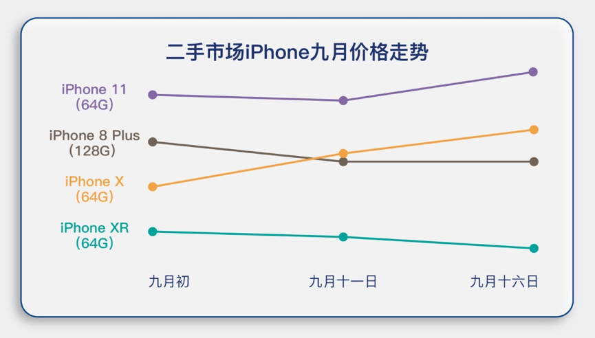 其中iPhone 11和iPhone X入门级机型售价和9月初相比涨幅已超过200元,此外99新iPhoneX(64G)涨价超过300元。除了上述两款机型,其他iPhone机型如新iPhoneSE、iPhoneXR和iPhoneXs系列等普遍降价,其中iPhone 8和iPhone Xs Max的99新入门级机型降幅超过了100元。