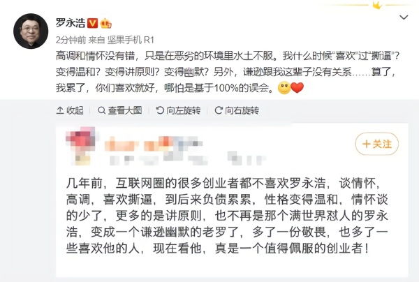 罗永浩说:“我什么时候‘喜欢’过‘撕*’?变得温和?变得讲原则?变得幽默?另外,谦逊跟我这辈子没有关系……”他还表示自己累了,大家喜欢就好,哪怕是基于100%的误会。