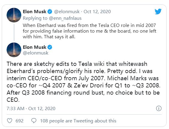 马斯克是在回复Twitter用户@enn_nafnlaus发布的一系列推文时做出上述澄清的。该用户发文声称,埃伯哈德创立了特斯拉,还称“马斯克从他手中偷走了特斯拉”。马斯克回应说: “2007年中期,当埃伯哈德因向我和董事会提供了虚假信息而被罢免特斯拉首席执行官职务时,没有人跟着他离开,这已经能够说明一切了。”