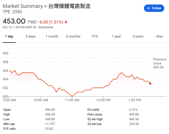 台积电今天在台湾交易所的开盘价为465.00元。截至周四收盘,台积电股价下跌6元,报收于453.00元,跌幅为1.31%。过去52周,台积电股价最高为466.50美元,最低为235.50元。