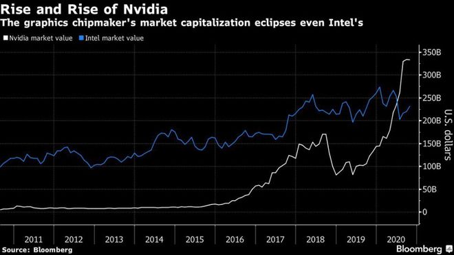 英伟达(白线)和英特尔股价走势比较 图片来自:彭博社