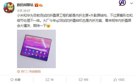 首先,华为和小米新款折叠屏手机都会用类似于三星Galaxy Fold的内折主屏 + 外部副屏的设计结构,OPPO或vivo 的工程机也采用内折方案,明年有望发布多款内折型的折叠屏手机。