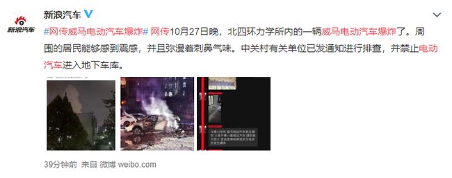 继“10.05”“10.13”两起福建邵武市威马新能源出租车自燃事件后,10月27日晚,位于北京北四环中国科学院力学研究所内的一辆威马电动汽车发生爆炸。