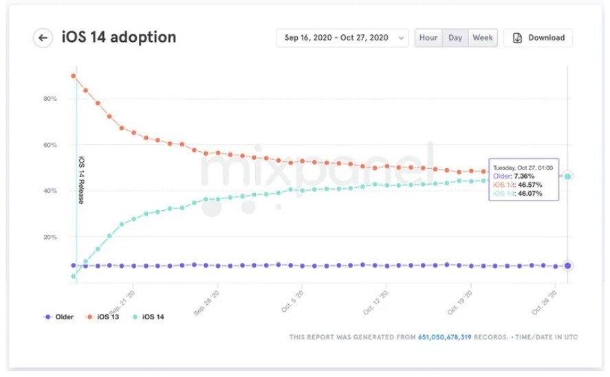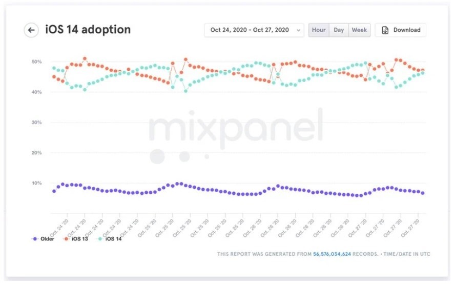在上周,随着 Mixpanel 数据中新设备的激活和统计,数据也以小时为单位发生变化,iOS 14 偶尔会超过 iOS 13。
