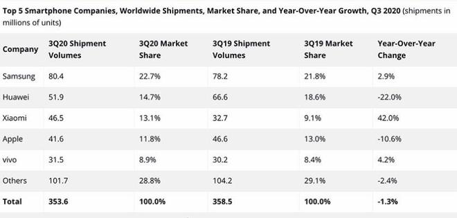 总体而言,这些制造商第三季智能手机出货量达3.536亿部,较去年同期下降1.3%。这一结果好于IDC最初的预测,由于新冠疫情继续蔓延,该机构预计出货量会降低9%。