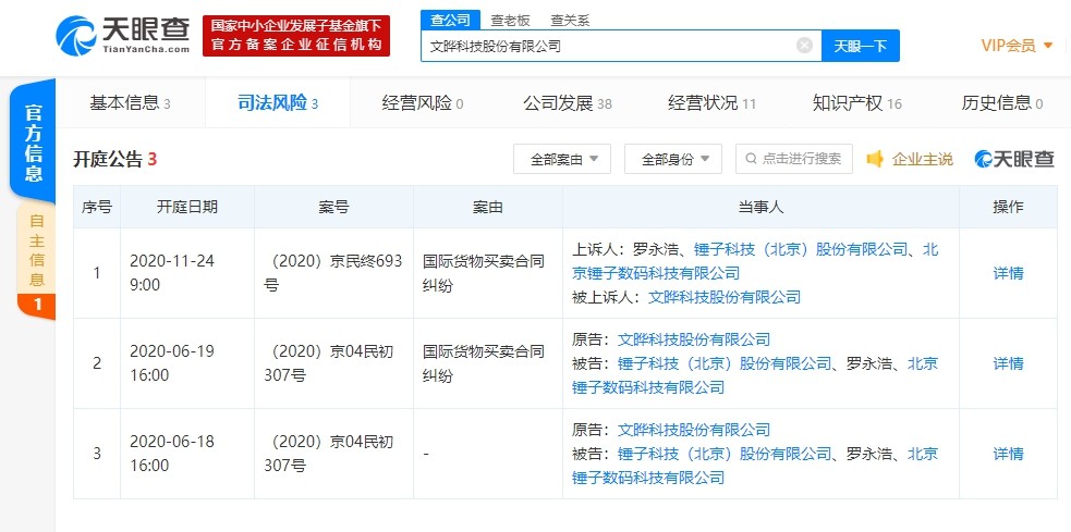 11月4日电 4日,天眼查App显示,近日,文晔科技股份有限公司新增二审开庭公告,案由为国际货物买卖合同纠纷,案号为(2020)京民终693号,开庭时间为11月24日。