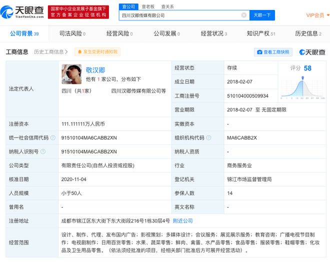 四川汉卿传媒有限公司成立于2018年2月,法定代表人为敬汉卿,经营范围包含设计、制作、代理、发布国内广告;影视策划等。