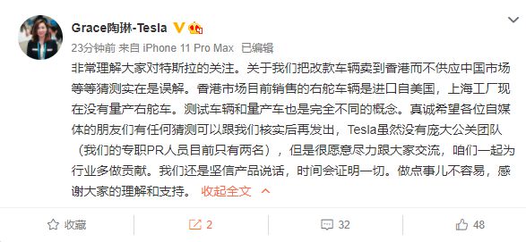 11月10日讯,近日,有博主爆料称香港有了改款的国产Model 3。对此,特斯拉对外事务副总裁陶琳在微博回应称,关于我们把改款车辆卖到香港而不供应中国大陆市场等等猜测实在是误解。香港市场目前销售的右舵车辆是进口自美国,上海工厂现在没有量产右舵车。测试车辆和量产车也是完全不同的概念。